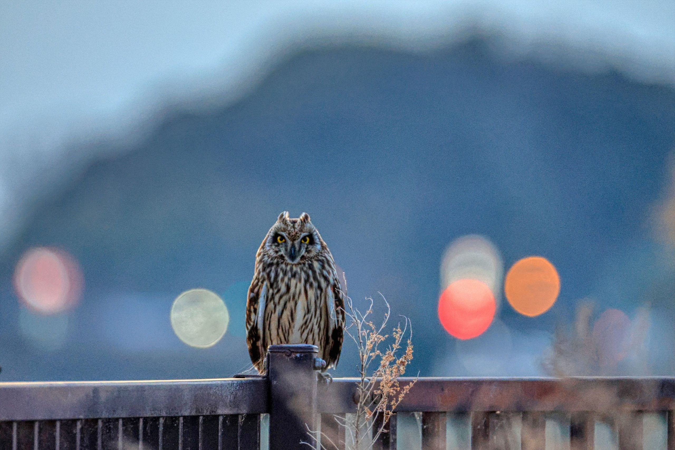 背景の夕暮れが少し寂しさも感じさせ、人懐っこい雰囲気にも見えます。