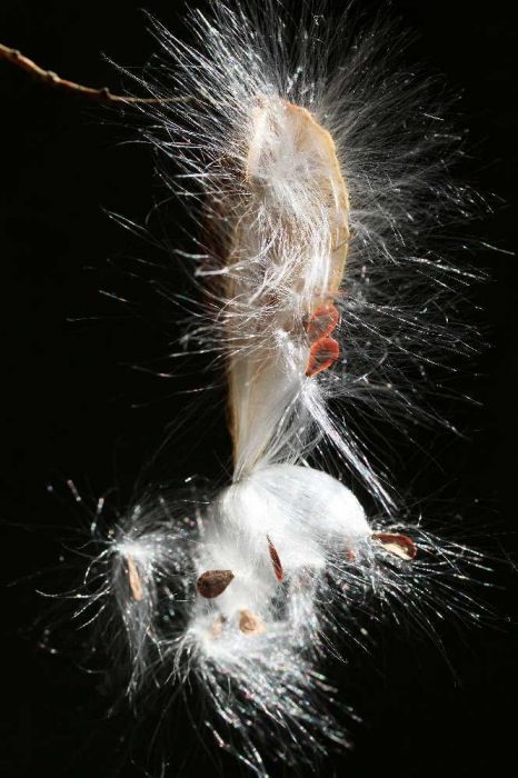 キジョラン(鬼女蘭)の種子がはじけた瞬間を見事に撮影しています。